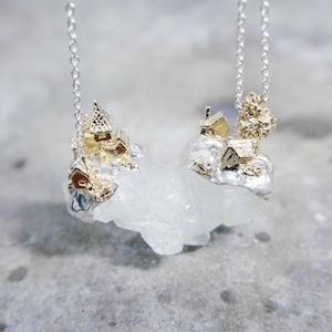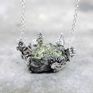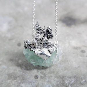 ロカは石・岩の意味。天然石を使用して、その上に建つ建築の姿を描いたネックレス。天然石は原石を使用し、石の形状にあわせてシルバーを制作しているため、すべて一点ものとして制作しております。グランデは特大級の天然石を使用したダイナミックなネックレスです。