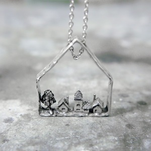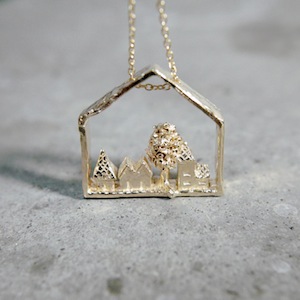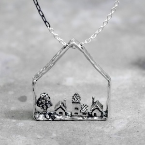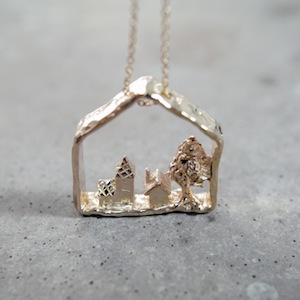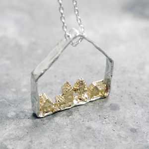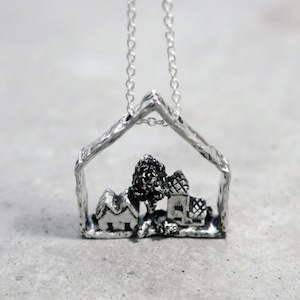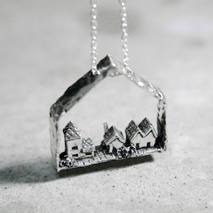 シウダッドは都市の意味。ソリッドな都市の風景を描いたネックレス。こちらも1点ずつ作り上げられた1点ものです。